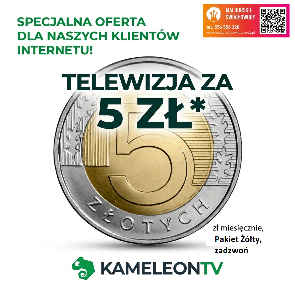 Piotr Wąsowicz2026-03-19T07:17:27+01:00Mamy dobrą wiadomość dla naszych klientów korzystających z internetu. Tylko teraz możesz włączyć telewizję w promocyjnej cenie 5zł miesięcznie. To prosty sposób, aby zyskać dostęp do wielu kanałów z filmami, sportem i rozrywką dla całej rodziny. - OFERTA DOSTĘPNA TYLKO DLA OBECNYCH KLIENTÓW INTERNETU MALBORSKIE ŚWIATŁOWODY. - SZYBKA AKTYWACJA - TYLKO 5 ZŁ MIESIĘCZNIE Zadzwoń