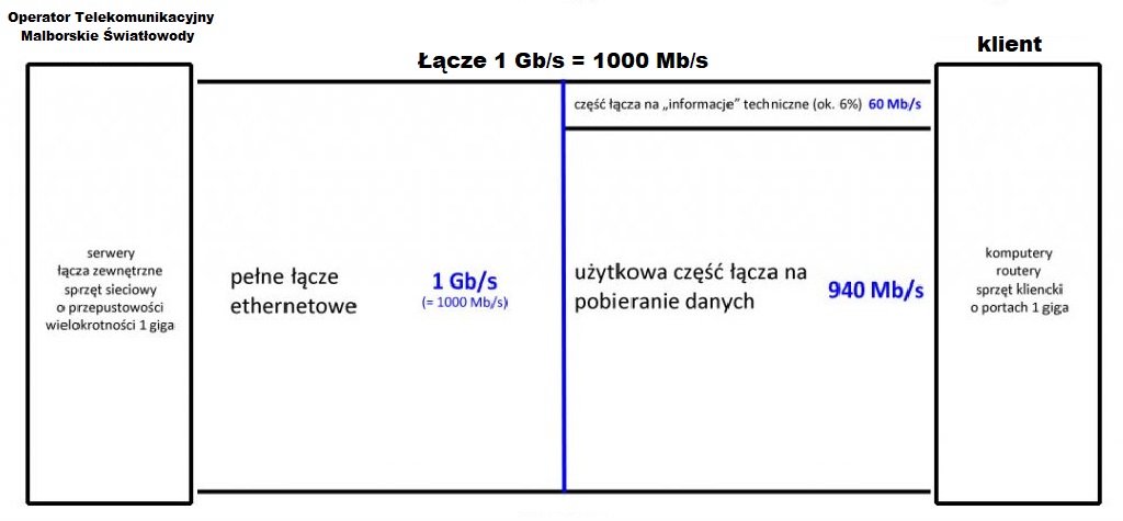 Oznacza to, że łącze 1Gb/s na pobieranie danych przeznacza około 940 Mb/s i taka właśnie wartość pojawi się w testach prędkości. Oznacza to również, że w przypadku łącza 400 Mb/s faktycznie zostaje udostępniane około 425 Mb/s. Dzięki temu na pobieranie zostaje 400 Mb/s.